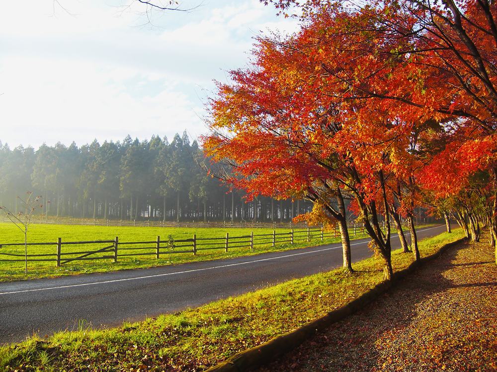 牧場の敷地内にはモミジやケヤキ、クヌギ、ナラなどが植えられ、赤・黄・茶のグラデーションが広がります。