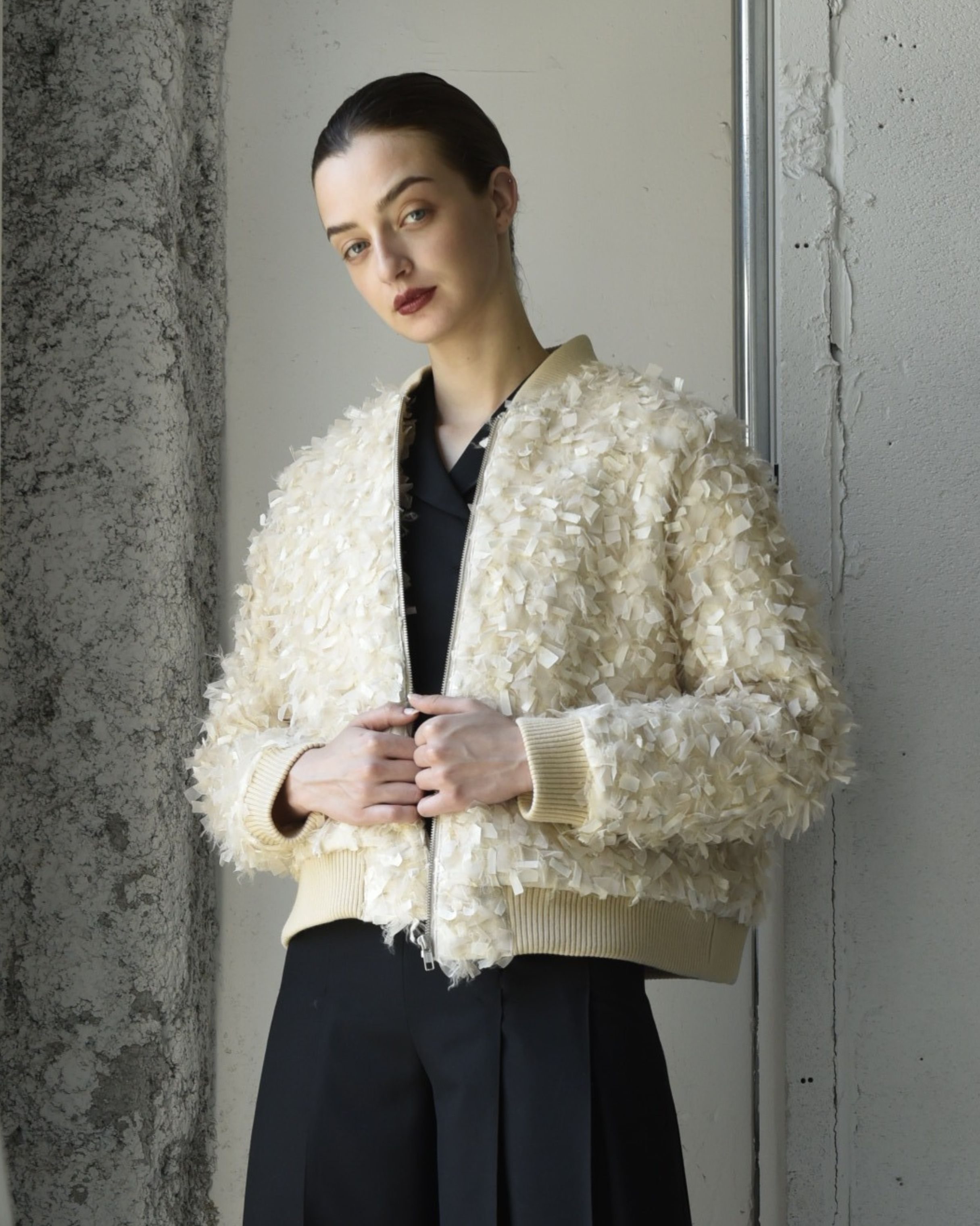 - 尾州産ファンシーツイードのジャケット:世界三大ツイード産地として有名な尾州の工場に特注したファンシーツイードを使用。MA-1スタイルにアレンジしたボンバージャケット