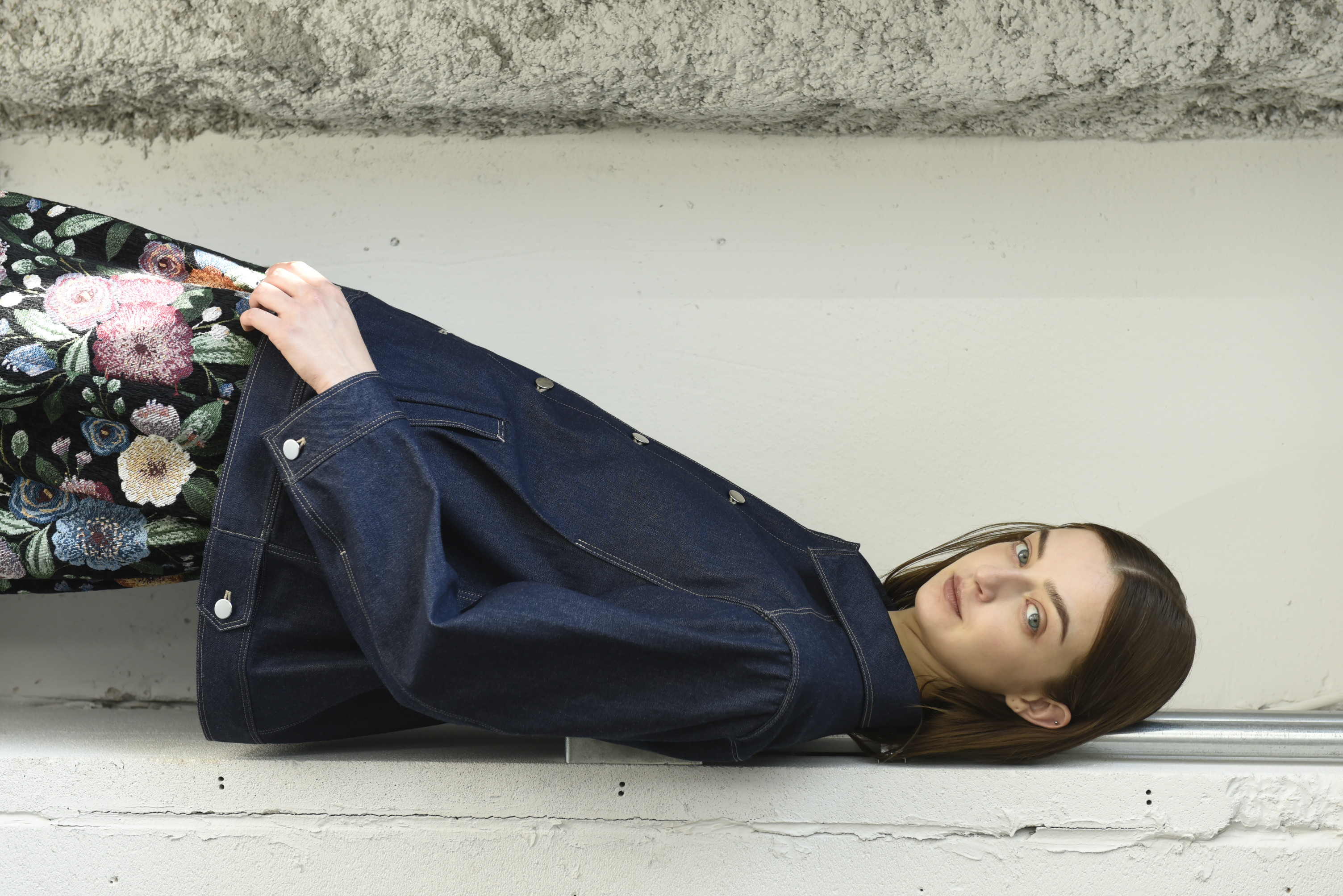 - 岡山産デニムのジャケット:世界から注目を集める、岡山のデニム生地を使用したデニムジャケット。裾が広がったペプラムスタイルにアレンジ。