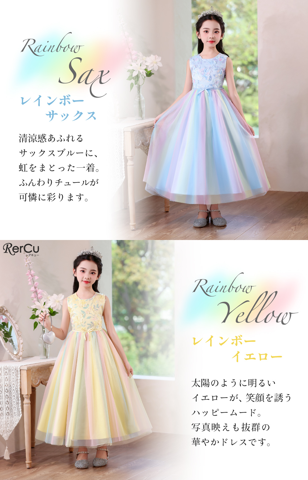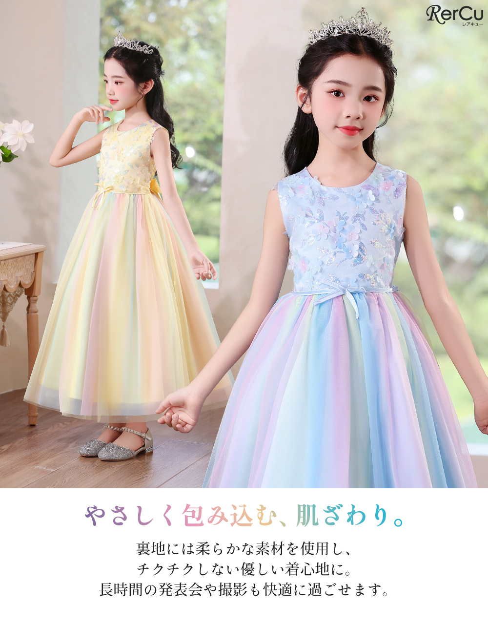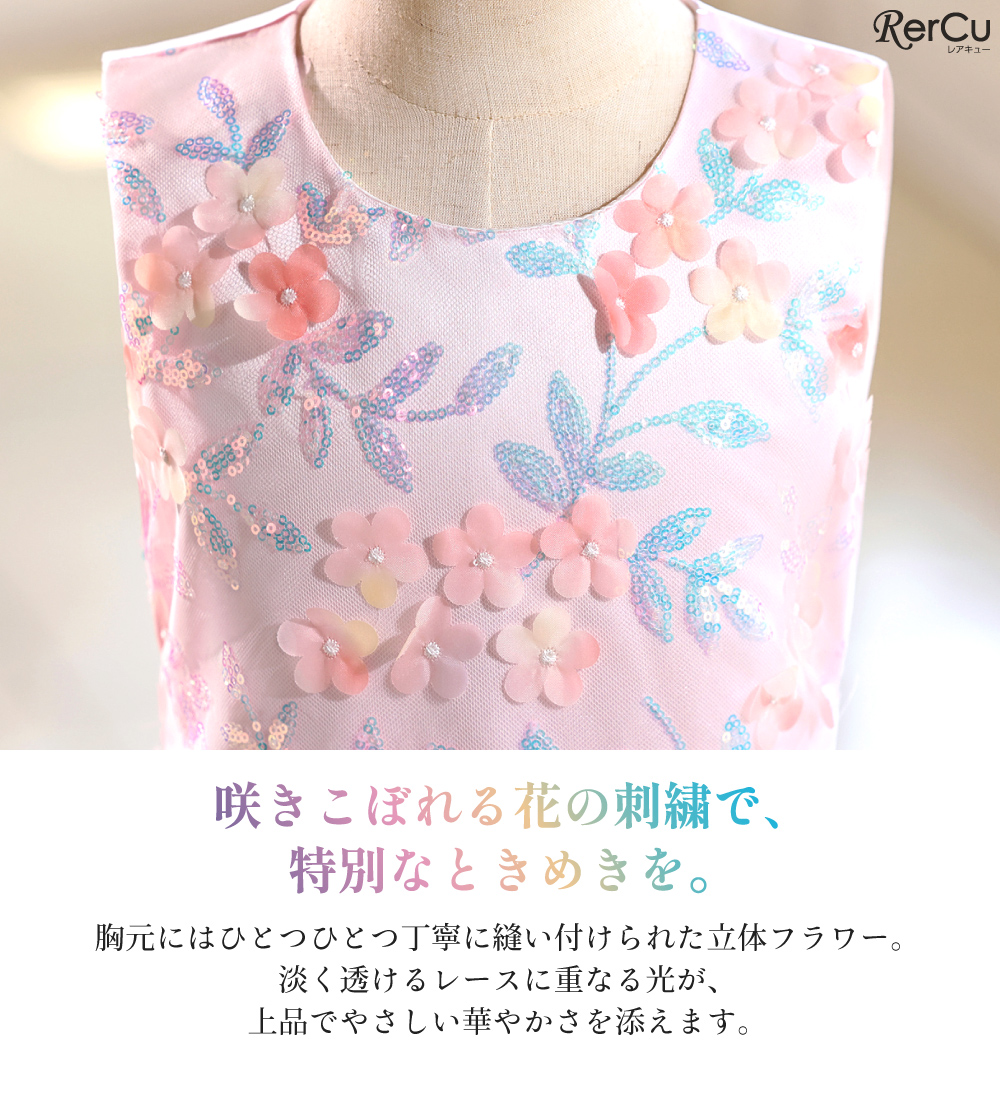 「RerCu(レアキュー)」は、“子どもたちが自分らしく輝ける日を”というコンセプトのもと展開するフォーマルブランドです。新作『夢色のブーケドレス(sk227)』は、淡いグラデーションチュールを重ね合わせたふんわりとしたスカートに、胸元を飾る立体フラワー刺繍が咲き誇る華やかな一着。ラメやスパンコールが光を受けてやさしく輝き、まるで虹のような幻想的な雰囲気を演出します。