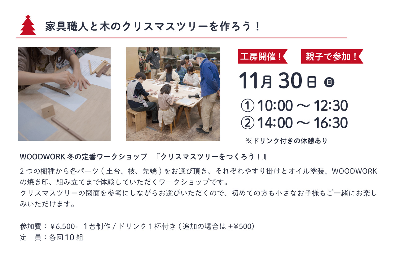 WOODWORKの冬の定番ワークショップ、『クリスマスツリーをつくろう!』を開催します。 木のパーツの中からお好きなものを選んで、やすりがけ → オイル塗装 → 組み立てまで 世界にひとつ、自分だけのツリーを手づくりしてみませんか? 今年は、ちょこんと飾れる小さめサイズ。 シンプルなデザインなので、木工が初めての方はもちろん、小さなお子さまと一緒でも安心して楽しめます。 これまでよりも少し太めになったパーツは、やすりのかけ方で表情が変わるのが面白いところ。 削る角度や力加減で、個性が光るツリーに仕上がります。 当日はWOODWORKの職人がサポートしますので、どうぞ気軽にご参加ください! 冬の思い出づくりに、あったかい木のツリーをぜひご一緒に!