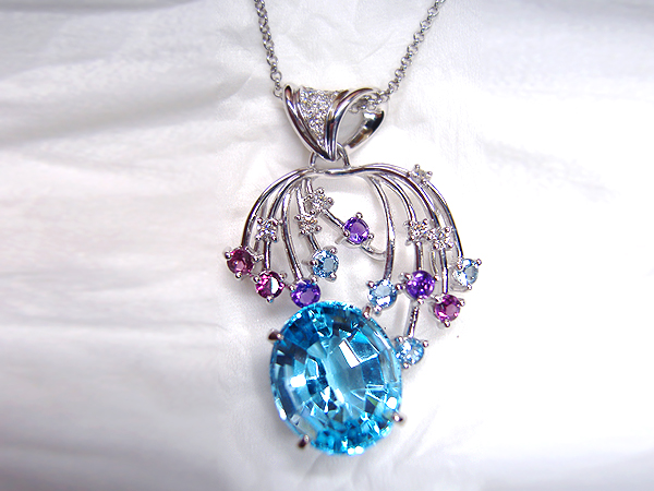 大きめのブルートパーズに秋と冬のイメージでカラーストーンを組み合わせ高級感も感じさせる「ハイジュエリー」に仕立てました。