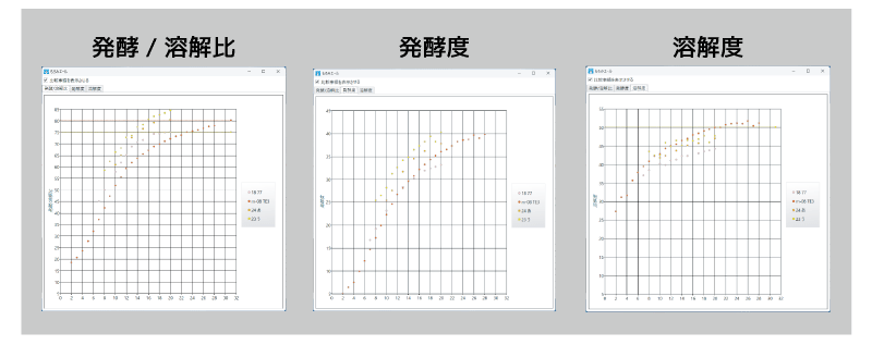 発酵の可視化に役立つ「溶解度」「発酵度」「発酵/溶解比」をアプリで自動算出し、グラフ表示や目標との比較がおこなえます。