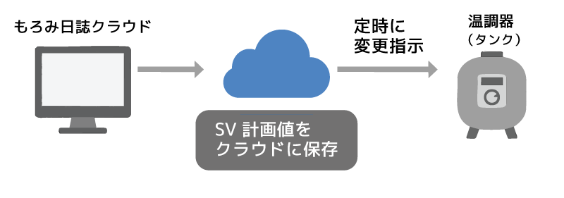 温調器の設定温度(SV値)を事前に登録し、クラウドが計画通りに実行。仕込み工程の温度管理の手間を大幅に削減します。