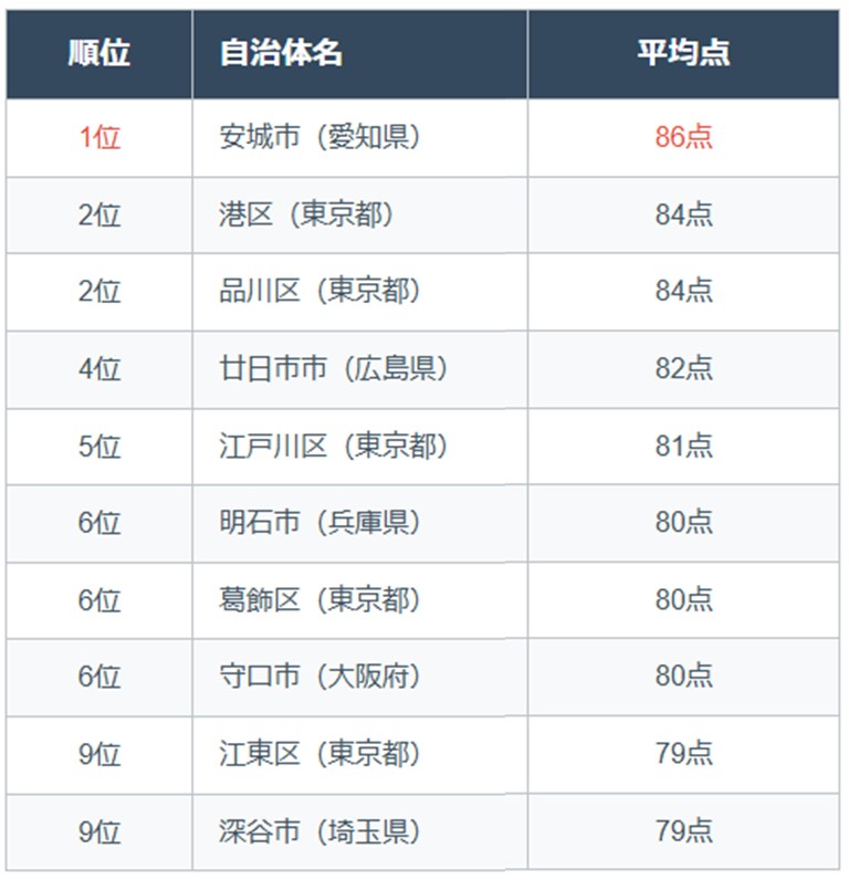 - 1位の安城市は、複数の取り組みがバランスよく連携