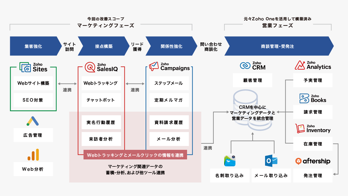 策定した「マーケティング設計図」に基づき、資料請求からWeb接客まで一貫した連動導線を構築。具体的には、Zoho CRMとSalesIQ、Campaigns、Sitesを連携させ、Webサイト訪問者の行動をリアルタイムに可視化し、最適なタイミングでの自動メール配信やアプローチを実現することで、自社Webを起点としたリード育成・商談化を可能にしています。