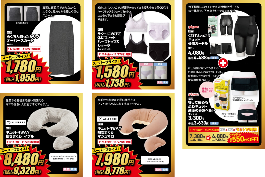 出産準備や子育てに欠かせない商品も多数ご用意し、皆さまのお買い物や赤ちゃんのいる暮らしをサポートしてまいります。