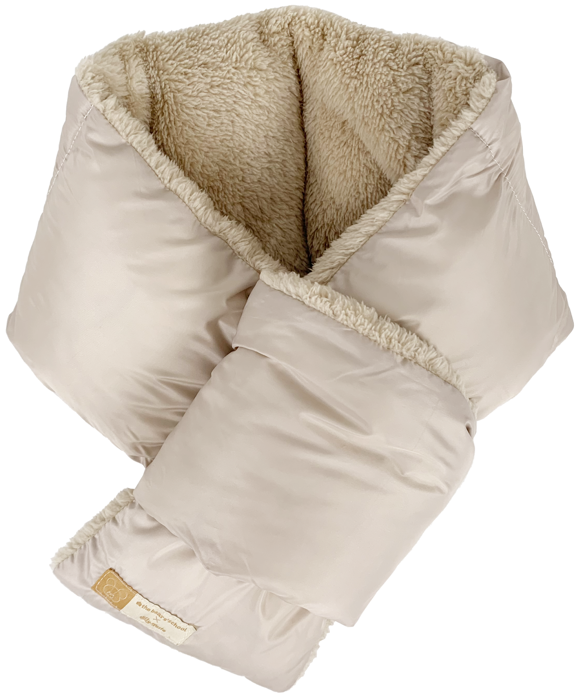 ふわふわのボア素材とキルティング生地を組み合わせた、冬にぴったりの中綿マフラーです。ナチュラルなカラーで、福袋限定の「くまのがっこう」のかわいらしいコラボタグがアクセント。軽量で暖かく、外出の際やおうち時間に活躍します。