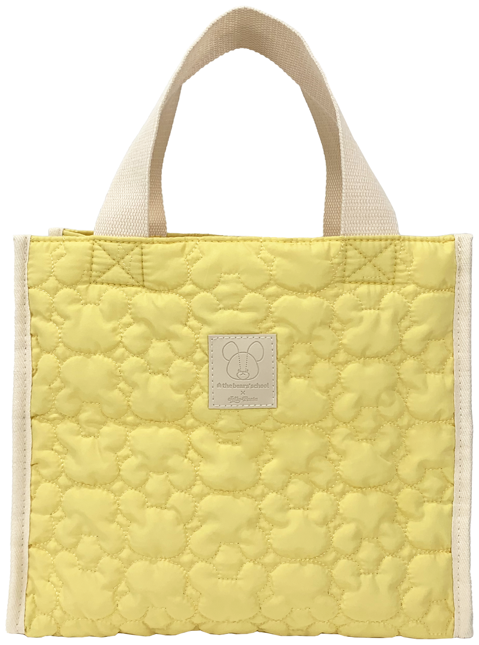 ふんわりとしたキルティング生地を使用したトートバッグです。表面は、「くまのがっこう」のジャッキーをイメージしたキルティングパターンを施したやさしいパステルイエローの生地にコラボ限定タグをあしらいました。持ち手にはしっかりとした綿混素材を使用しているため、快適にご利用いただけます。また、裏地には、絵本『ジャッキーのトマトづくり』をモチーフにしたオリジナルイラストをプリントしました。ジャッキーやトマト、キッチンアイテム、ジョリーパスタを表現したパスタが散りばめられたカラフルなデザインで、開けるたびに楽しい気分にさせてくれます。軽量ながらもマチ付きで収納力があるため、普段使いに活躍すること間違いなしです!