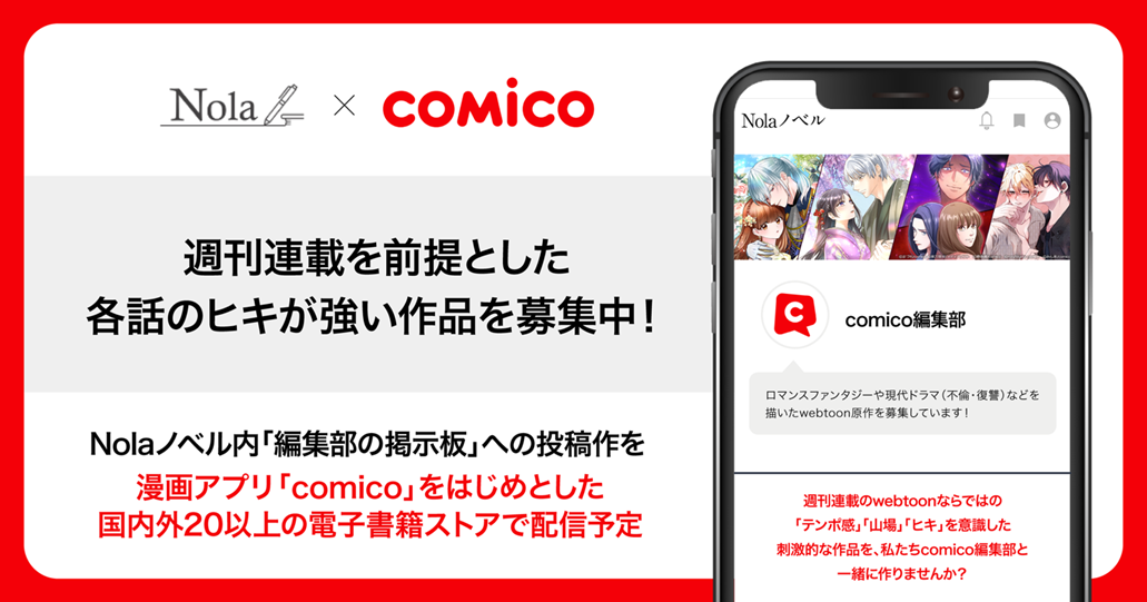 国内累計2,500万ダウンロードを突破している漫画アプリ「comico ※1」を提供するNHN comico株式会社(本社:東京都港区、代表取締役社長:丁 佑鎭、以下「comico」)と、60万人を超える作家の皆さまが登録する創作プラットフォーム「Nola(ノラ)※2」を提供する株式会社indent(本社:東京都千代田区、代表取締役社長:釜形 勇気、以下「indent」)は、11月11日(火)より、indentが運営する小説投稿サイト「Nolaノベル」内「編集部の掲示板」に「comico編集部」の原作募集ページを開設し、『ロマンスファンタジー』『現代ドラマ(不倫・復讐)』『TL(ティーンズラブ)』『BL(ボーイズラブ)』ジャンルにおけるwebtoon原作のスカウトを開始いたしますことをお知らせいたします。