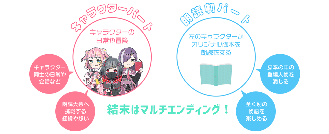 ボイストの公演は、キャラクターの日常と冒険が楽しめるキャラクターパートと、そのキャラクターがオリジナル脚本を朗読する朗読劇パートに分かれます。