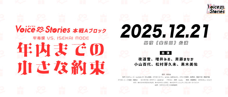 ステキコンテンツ合同会社(本社:東京都中央区 代表:中村 航)は、新感覚メディアミックスプロジェクト「ボイスト Voice & Stories」にて、2025年12月21日(日)に上演する『Voice&Stories 本戦Aブロック T.G.S.牢毒蝶R.S. vs. ISEKAIMODE「年内までの小さな約束」』のチケットを、2025年11月13日(木)より販売開始することを決定しました。