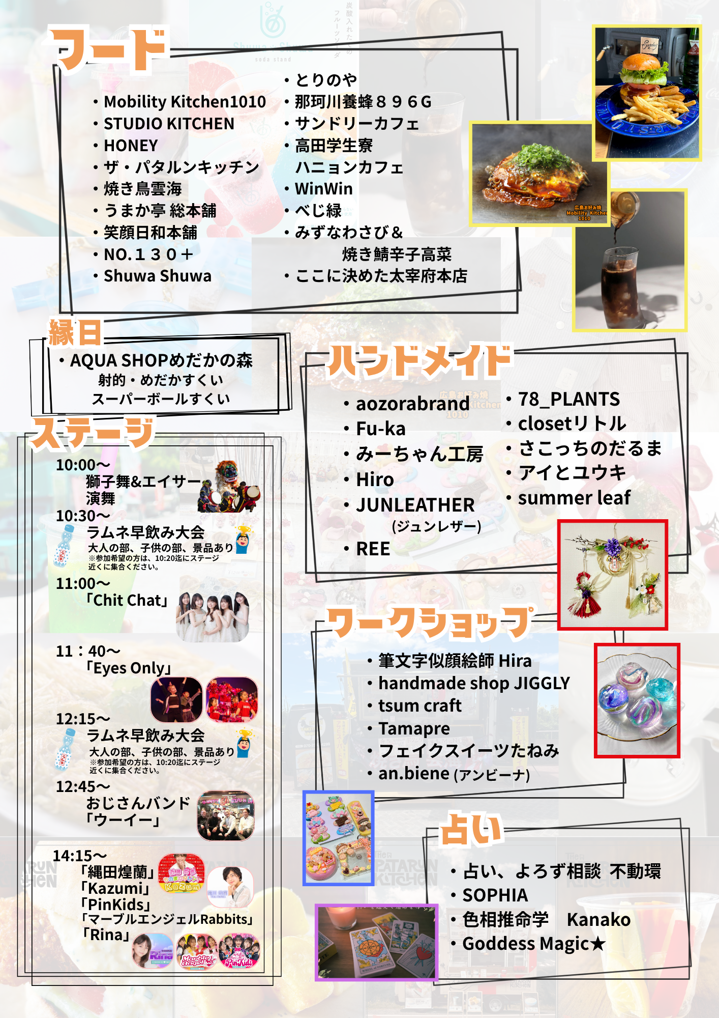 野外ステージでは、福岡のアイドルや地元ダンスチームやアマチュアバンドによるパフォーマンスで会場を盛り上げます。さらに、企画の一つとして「ラムネ早飲み大会!」を実施。参加型のユニークな企画を通じて、子どもから大人まで驚きと笑顔あふれる1日を提供します。