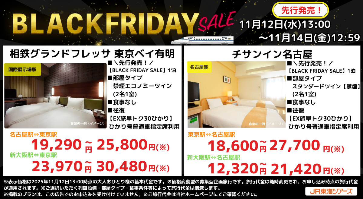 株式会社ジェイアール東海ツアーズ(本社:東京都中央区、以下JR東海ツアーズ)は、2025年11月14日(金)から12月1日(月)まで開催する「BLACK FRIDAY SALE」の一般発売に先駆け、LINEアカウント連携をしていただいている方を対象に、11月12日(水)13時から11月14日(金)12時59分までの期間限定で、先行発売いたしました。1月以降の「新幹線+ホテル」を使った旅行をいち早く予約できるチャンス!コスパ重視のホテルから憧れのラグジュアリーホテルまで多彩なラインナップ!一年に一度のお祭りセールで新幹線旅行をおトクに先取りできるこの機会をお見逃しなく! 新幹線の時間変更が無料で何度でも可能(※)で1か月以上先の旅行でも予約と同時に利用新幹線が確定するのはEX旅パックだけ!冬のイベントやライブ、そして春休みまで、新幹線旅行はJR東海ツアーズのEX旅パック「BLACK FRIDAY SALE」を必ずチェック! ※新幹線の時間変更に制限のある商品があります。