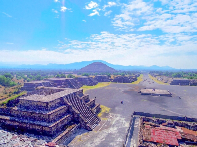 メキシコシティから北東へおよそ50km、車で約1時間。広大な高原に姿を現すのが「テオティワカン遺跡」です。名前の意味は「神々が創られた場所」。紀元前後から7世紀ごろにかけて栄え、最盛期には10万人以上が暮らしたとされる巨大都市。太陽と月、そして死者の道――その名の通り、どこか神秘的な空気が漂います。