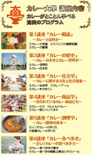 ・カレーに関する概論、 歴史、 文化(社会学)、 商品知識(商品学)、 調理料理方法(調理学)、 食べ歩き法などのカレーを体系的かつ実践的に学びます。