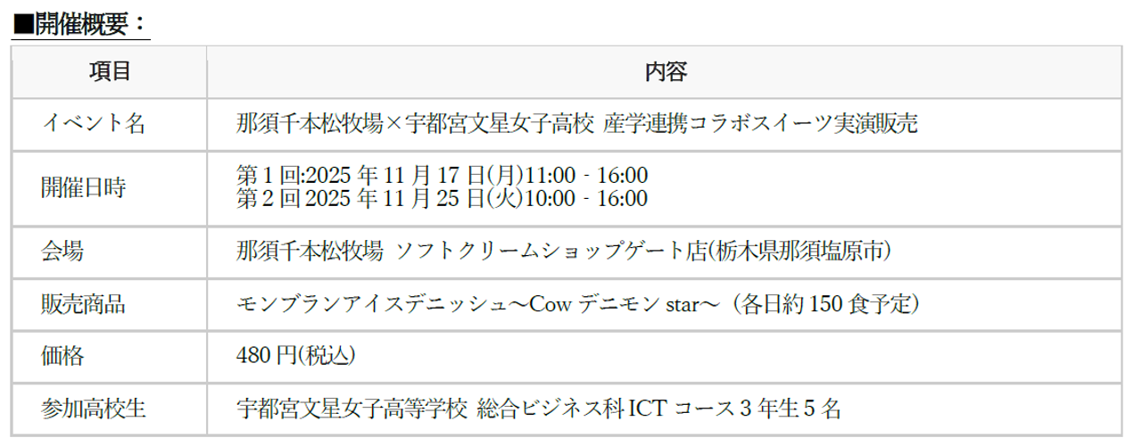 今回の取り組みは、従来の「企業×学校」の枠を超え、地域の菓子工房「アトリエG」を巻き込んだ"地域循環型"の産学連携に進化いたしました。宇都宮文星女子高等学校 総合ビジネス科 ICTコースの生徒5名が商品企画・開発・販売までを一貫して体験し、千本松牧場アイスクリームと県内人気パティスリー「アトリエG」のデニッシュを組み合わせた新スイーツ「モンブランアイスデニッシュ~Cowデニモンstar~」の実演販売を通じて、実践的なビジネススキルを習得します。