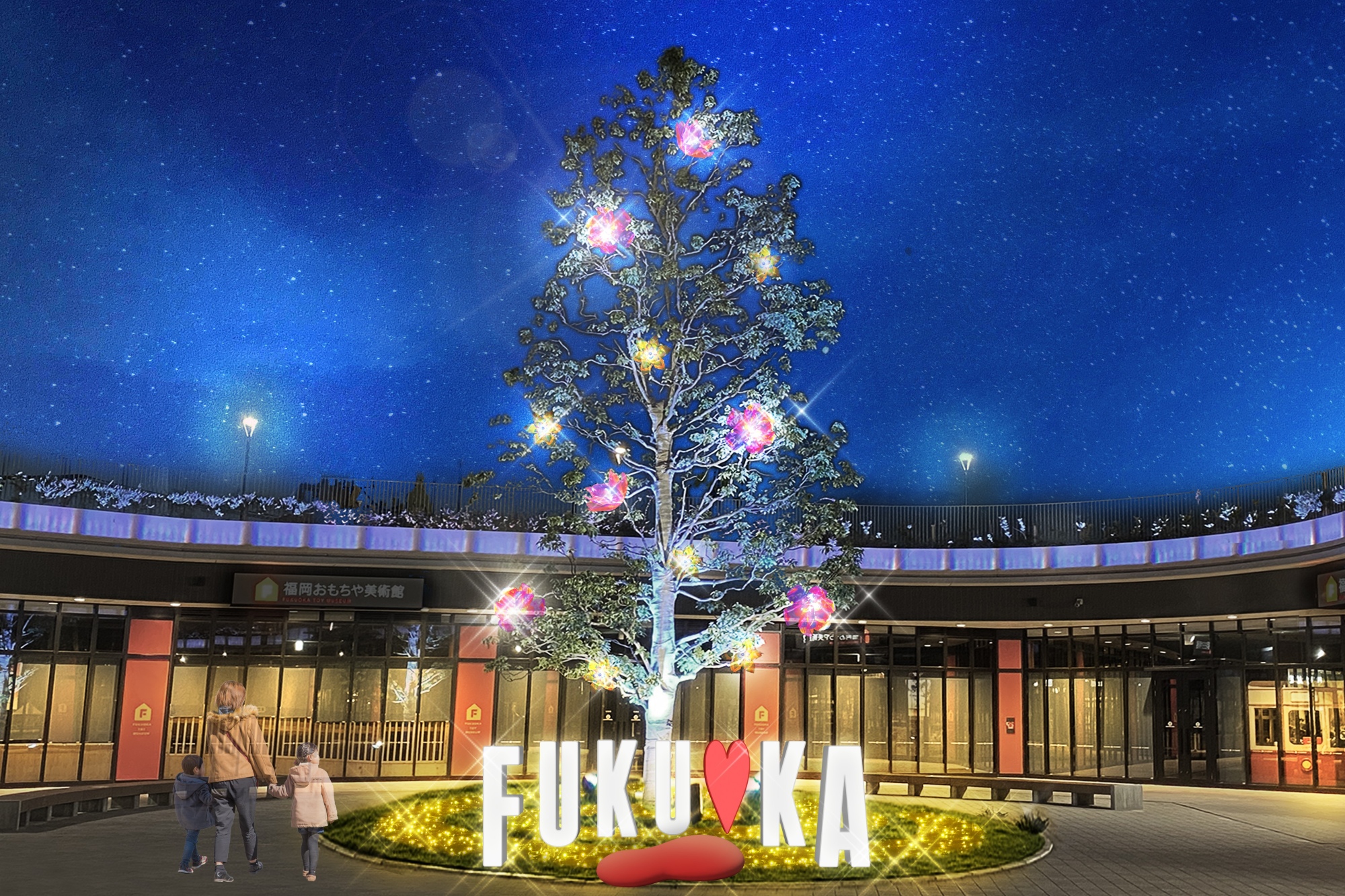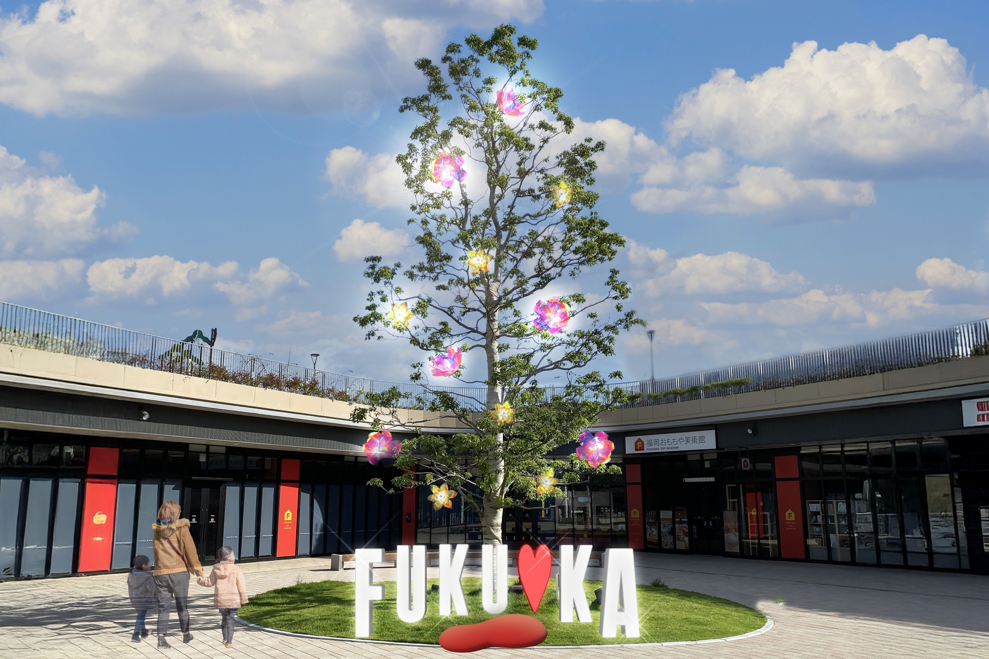 福岡ならではの明太子をイメージしたオリジナルベンチと昼と夜で表情が変わるシンボルツリー