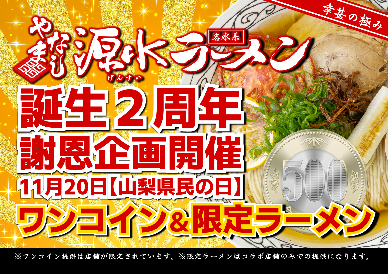 【イベント概要】イベント名:「やまなし源水ラーメン 2周年記念ワンコイン企画」