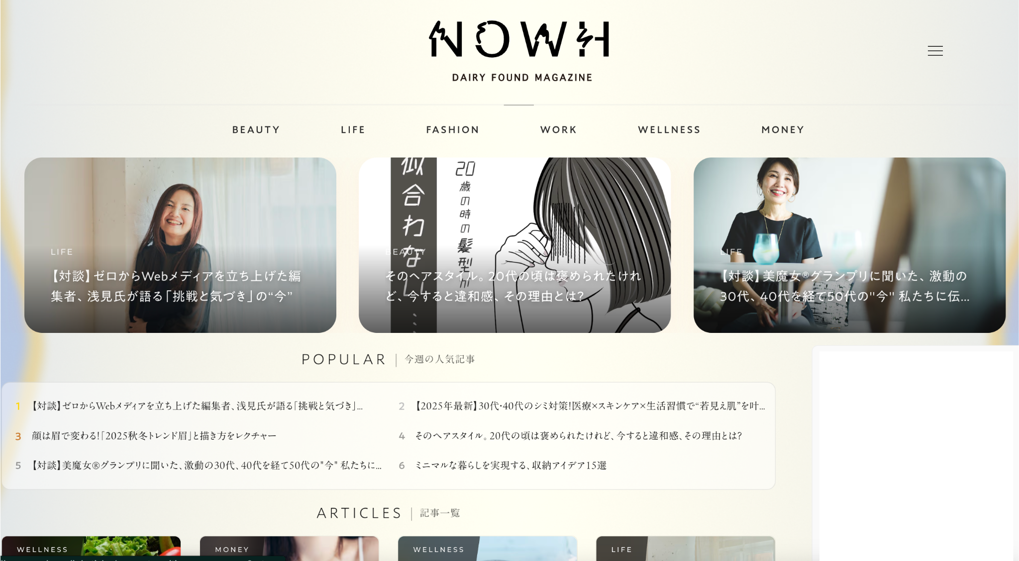 NOWHを届けたいのは30〜40代の女性を中心に、キャリアやライフスタイルにおいて変化と向き合う時期を迎え、心身や環境の揺らぎに気づき始めるフェーズにいる方です。心身のセルフケア、パートナーシップといった人間関係など、読者が直面する多様な悩みに寄り添います。