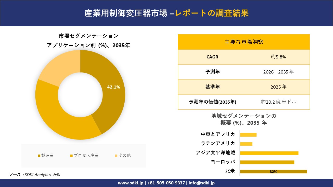 東京都渋谷区、2025年11月10:SDKI Analyticsはこのほど、「 産業用制御変圧器市場に関する調査レポート : 予測2026―2035年」を発行しました。調査レポートは、 産業用制御変圧器市場の成長に貢献する統計的及び分析的アプローチに焦点を当てています。弊社の読者は、現在の市場シナリオに関する明確なイメージを得るとともに、詳細な調査レポートで提供される主要な業界の洞察から将来の傾向についても理解します。産業用制御変圧器市場に関するこの調査レポートは、一次調査方法と二次調査方法の両方を利用して、市場の成長に伴う現在及び将来の市場動向を分析します。