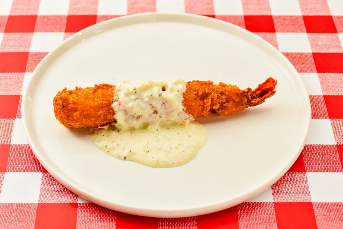 太く食べ応えのあるぷりぷりのエビを使用し、しっかりとした衣で揚げた一品はサクサクとした食感が特徴。ナポリタンとも相性抜群のタルタルソースを添えて提供します。