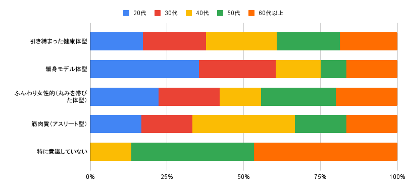 自由記述で「美しい体型」の定義を尋ねたところ、年代を問わず共通するキーワードは「健康」「姿勢」「自然体」でした。年齢を重ねるほど、「数字」より「姿勢」「雰囲気」「継続できる生活習慣」が美しさの基準になることが分かりました。