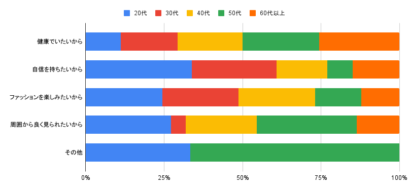 理想の体型を目指す一番の理由として、全体の53.3%が「健康でいたいから」を挙げました。20代では「自信を持ちたいから」(41.7%)が最も高い一方、50代以降は「健康でいたいから」が65.0%〜68.3%と圧倒的で、年代とともに「健康」を軸に自分の心身を守る意識へと変化していることが分かりました。