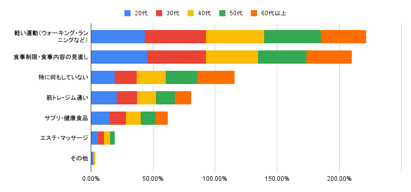体型維持・改善のために取り組んでいることとして、「軽い運動(ウォーキング・ランニングなど)」が45.8%、「食事制限・食事内容の見直し」が43.2%と、手軽で継続しやすい方法が二大主流となりました。「筋トレ・ジム通い」は16.3%に留まり、多くの女性が「頑張る」のではなく「続く」を選ぶ傾向が明確です。