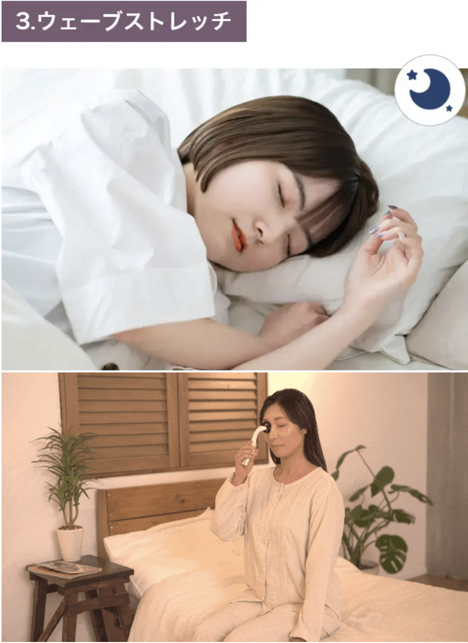 仕事やスマホの使用で酷使した目元やその周りを、やさしいウェーブストレッチで心地よくケア。