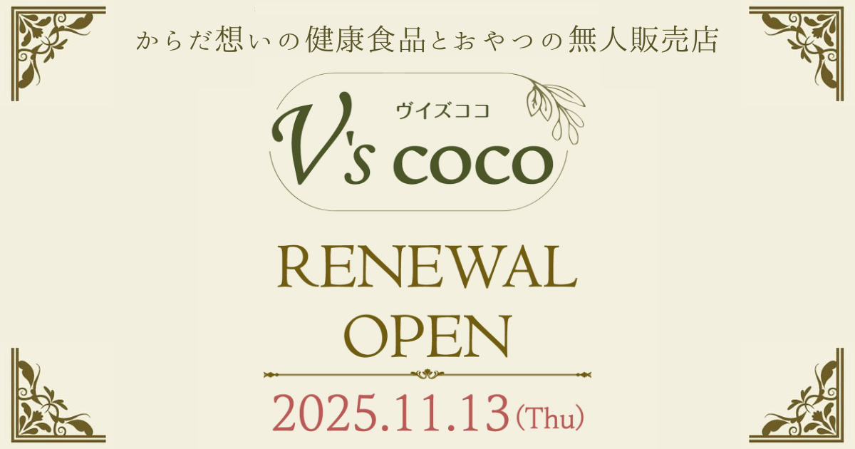 「自然派おやつココアイ 北千住店 」は、この度、運営を株式会社バルテック(本社:東京都新宿区) に正式に移管し、24時間営業の無人自然食品店「V’S COCO(ヴイズココ)」としてリニューアルオープンいたします。 2025年11月13日(木)のグランドオープンでは、これまでの体に優しいお菓子に加え、厳選されたオーガニック食品や無添加の調味料など、日々の健康をサポートする自然食品を幅広く取り揃え、地域の皆様のウェルネスライフを応援します。