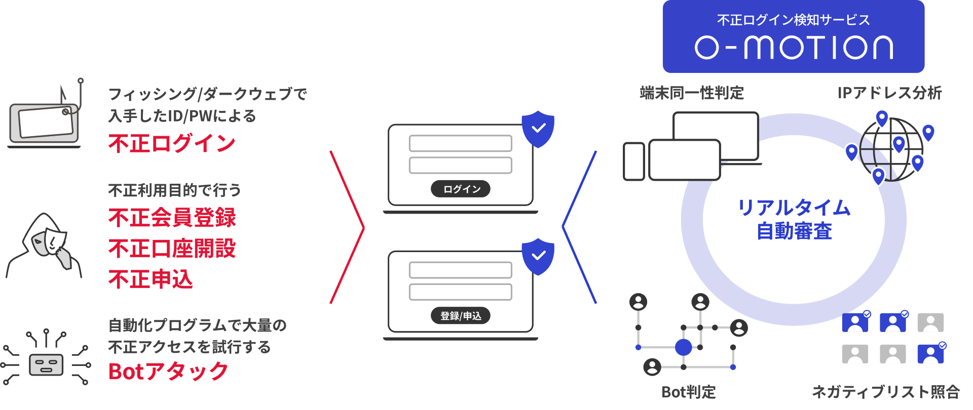 特許取得済みの端末特定技術に加え、IPアドレス分析・Bot判定・ネガティブリスト照合を組み合わせた独自ロジックにより、なりすましによる不正ログインや同一人物による複数の会員登録・口座開設・申込を高精度に検知します。