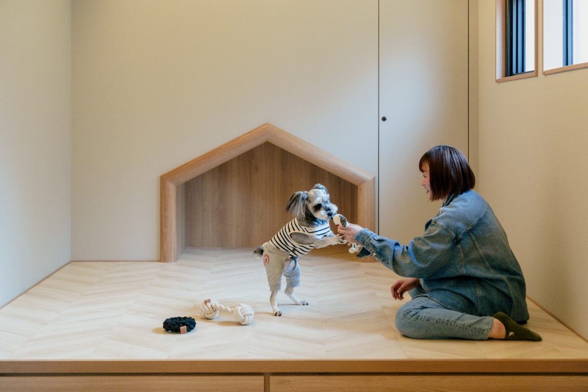 わんファミリー温泉付山荘は、小型犬3頭まで・中型犬は2頭までご一緒にお過ごしいただける、一戸建て温泉付きの客室です。床にはクッション性の高い素材を採用。段差のないフラットな室内は、わんちゃんにも飼い主さまにも安心・安全です。壁やソファーには防臭・防汚性に優れた素材を用いており、汚れを気にせず、愛犬とのびのびとお過ごしいただけます。