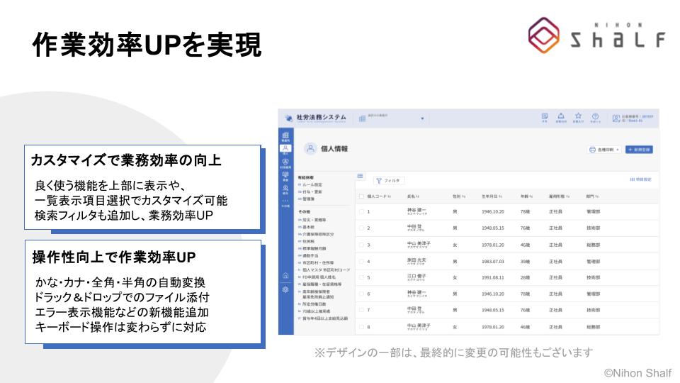 株式会社日本シャルフ(本社:東京都新宿区、代表取締役:高田 弘明)は、創業以来40年以上にわたり社会保険労務士事務所や企業の労務管理を支援してまいりました。このたび、従来の「社労法務システム」を大幅に強化し、2026年2月上旬より「次世代社労法務システム」を提供開始いたします。
