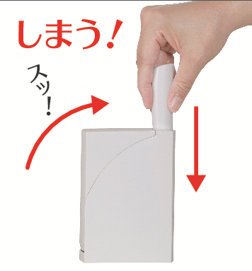 持ち手を折りたたんで縦置きできる超コンパクト設計。生活感を隠すスマートな収納ケース付きです。