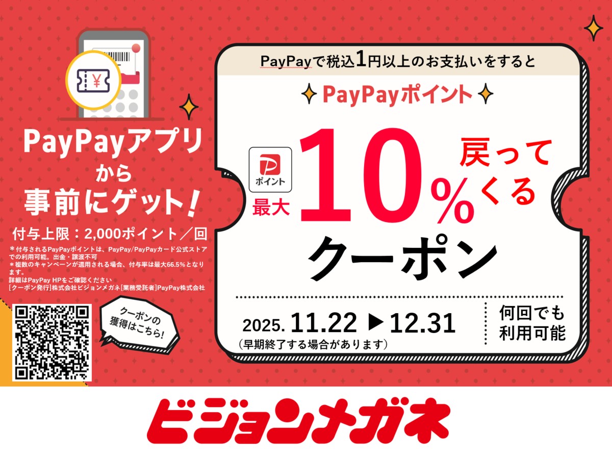 全国で眼鏡専門店を運営する(株)ビジョンメガネ(大阪市)は、スマートフォン決済サービス「PayPay」の利用で、最大10%のPayPayポイントを付与するキャンペーンを開催します。