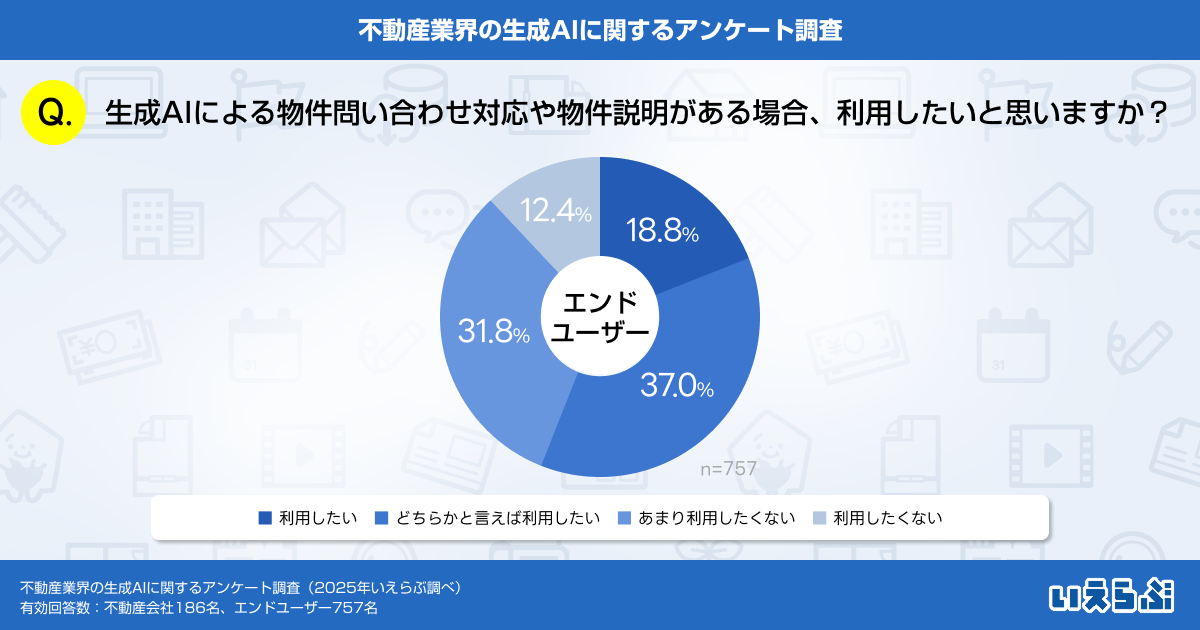 エンドユーザーに「生成AIによる物件問い合わせや物件説明がある場合、利用したいと思いますか?」と質問したところ、「利用したい」(18.8%)および「どちらかといえば利用したい」(37.0%)と答えた人は合わせて約半数となりました。一方で、「あまり利用したくない」(31.8%)および「利用したくない」(12.4%)と答えた人もほぼ同数を占めました。