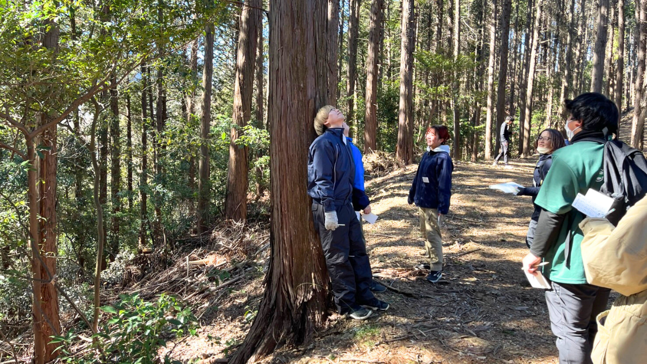 ヒノキの林で深呼吸し、自然の中にある様々な香りを楽しみます。ヒノキ風呂など生活の中で活用される木ですが、あまり馴染みがない人も多いかもしれません。ガイドの解説を聞きながら実際に木に触れてみましょう。