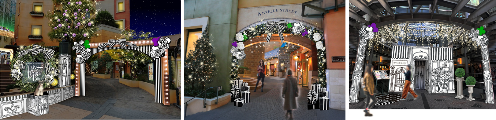 施設内の各所が、グラフィカルなモノトーンイラストレーションと、キラキラと輝くイルミネーションのコントラストが織りなす空間は、まるでアートギャラリーに迷い込んだかのよう。訪れる人を非日常の“キレイ”の世界へと誘います。