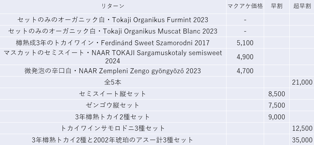 また、特別に2002年ヴィンテージの琥珀色のトカイアスー(写真右)をセットに入れたリターンも作っています。このトカイアスーは弊社の旗艦商品です。割安な価格設定にしておりますので、トカイワイン好き、貴腐ワイン好きの方はぜひお試しください。