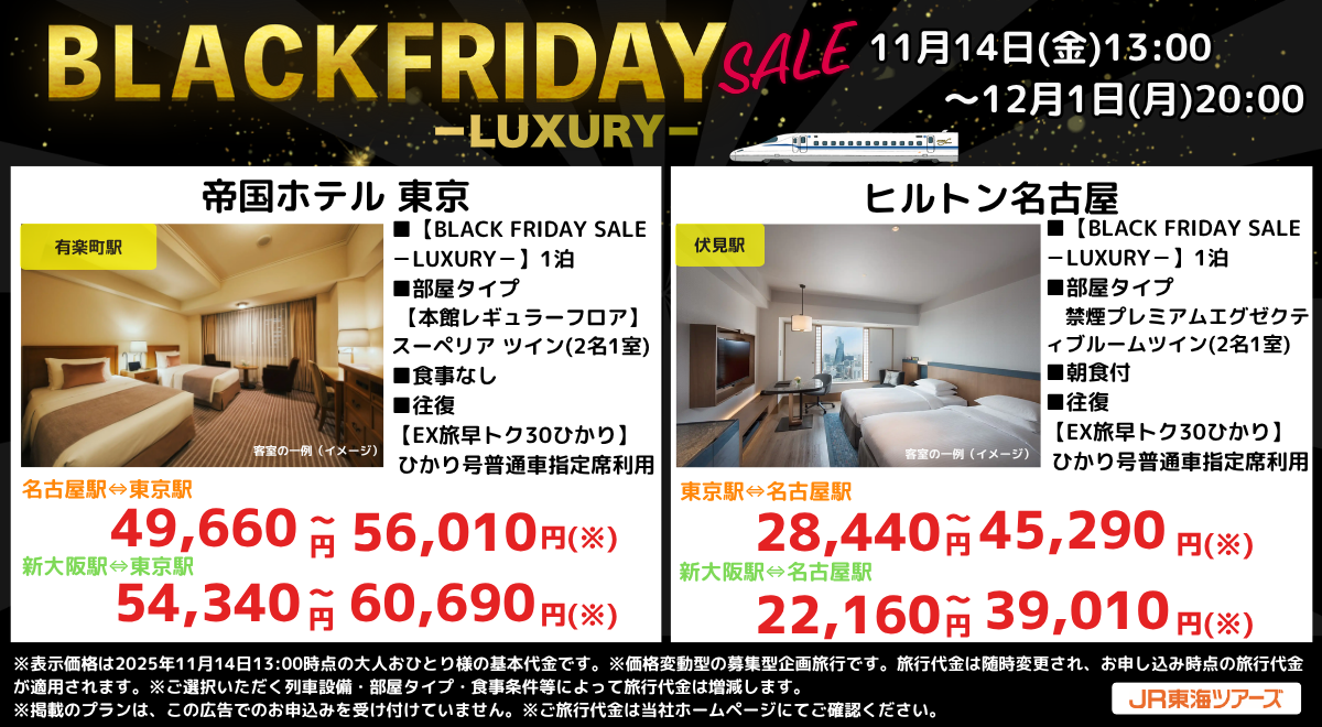 株式会社ジェイアール東海ツアーズ(本社:東京都中央区、以下JR東海ツアーズ)は、2025年11月14日(金)から12月1日(月)までの期間限定で「BLACK FRIDAY SALE」を開始いたしました。1月以降出発の「新幹線+ホテル」を期間限定の衝撃価格でご予約いただけます。コスパ重視のホテルから憧れのラグジュアリーホテルまで多彩なラインナップからお選びください。一年に一度のお祭りセールで新幹線旅行をおトクに予約できるこの機会をお見逃しなく! 新幹線の時間変更が無料で何度でも可能(※)で1か月以上先の旅行でも予約と同時に利用新幹線が確定するのはEX旅パックだけ!冬のイベントやライブ、そして春休みまで、新幹線旅行はJR東海ツアーズのEX旅パック「BLACK FRIDAY SALE」を必ずチェック! ※新幹線の時間変更に制限のある商品があります。