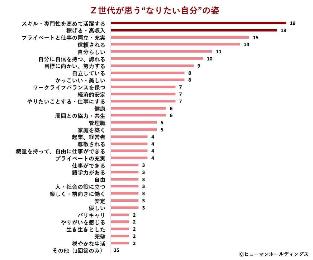 Q3. Z世代の“なりたい自分”は、「スキル・専門性を高めて活躍」「稼げる」「高収入」など、仕事における成長や経済的な安定を求める姿が多数