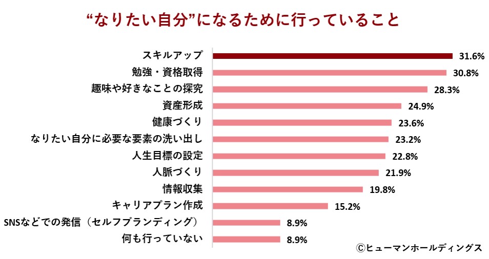 Q1で“なりたい自分”の姿を思い描けていると回答した237名に、“なりたい自分”になるために行っていること(複数回答可)を聞くと、学びやスキルアップを通じて自己成長する行動を重視している傾向が浮かび上がりました。「スキルアップ(31.6%)」「勉強・資格取得(30.8%)」が上位となり、日々の努力で理想像に近づこうとする姿勢がうかがえます。