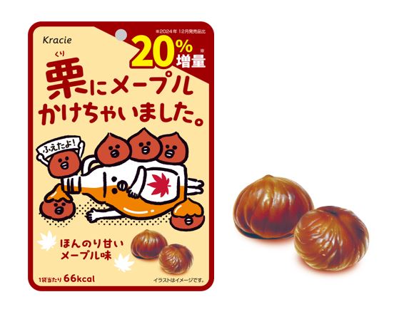 2024年に発売した「栗にメープルかけちゃいました。」は、若年層をターゲットに、スイーツのような甘さとキャラクター入りのパッケージで好評を得ました。「もっと多く食べたい」という声に応え、美味しさはそのままに20%増量して再発売いたします。1袋あたり66kcal、脂質0.5g、食物繊維2.1gで、罪悪感なく楽しめる間食としておすすめです。