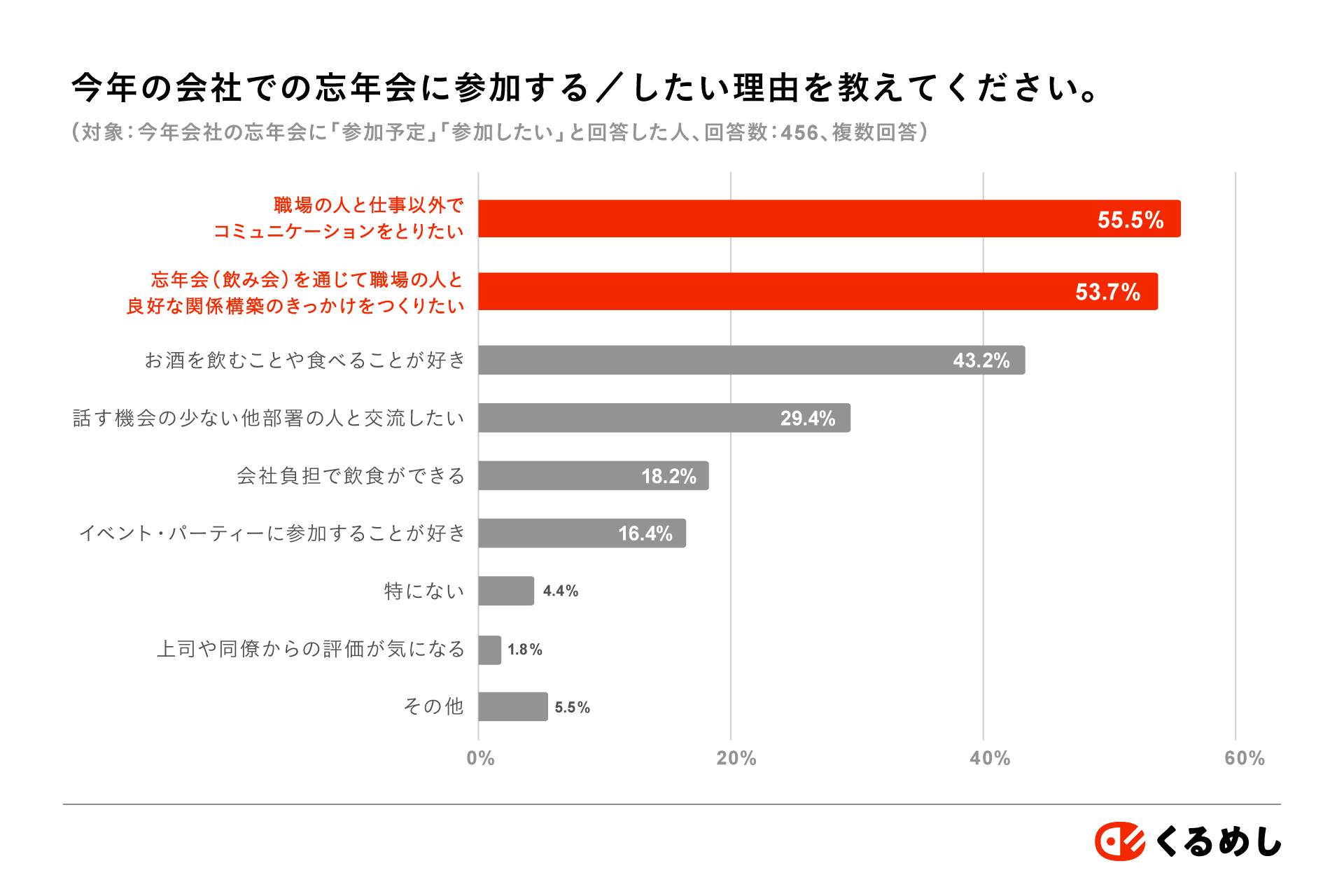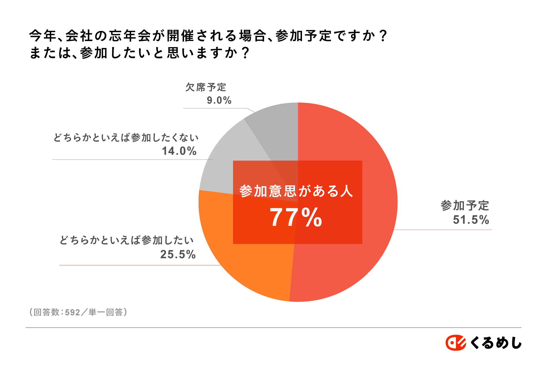 近年、忘年会や飲み会に対して懐疑的な意見も見られますが、「会社の忘年会に関する調査 (2025)」においては忘年会への参加意欲がある人が77%と、前向きにとらえている人も多いことが分かりました。忘年会を通じて、業務以外でのコミュニケーションを求めている方も少なくないようです。
