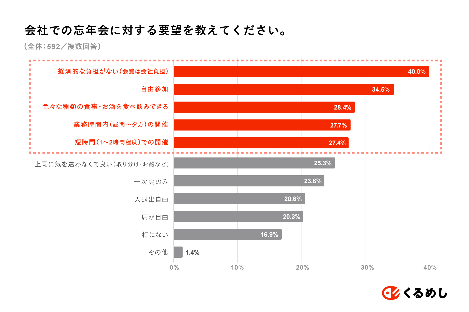 同調査において、会社での忘年会に対する要望を聞くと、「自由参加」34.5%、「業務時間内(昼間〜夕方)の開催」27.7%、「短時間(1〜2時間程度)での開催」27.4%など、“参加しやすさ”を求める声が上位に。「会費の会社負担」40.0%を望む声も多く、金銭・時間両面での配慮が求められています。