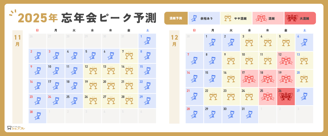 当社では12月26日に忘年会のピークを迎えるという予測を立てています。12月は金曜日や3週目にも混雑の兆しが見えており、11月下旬〜12月上旬の少し早めの時期にランチタイムや終業1時間前など、就業時間内での忘年会開催をおすすめしています。