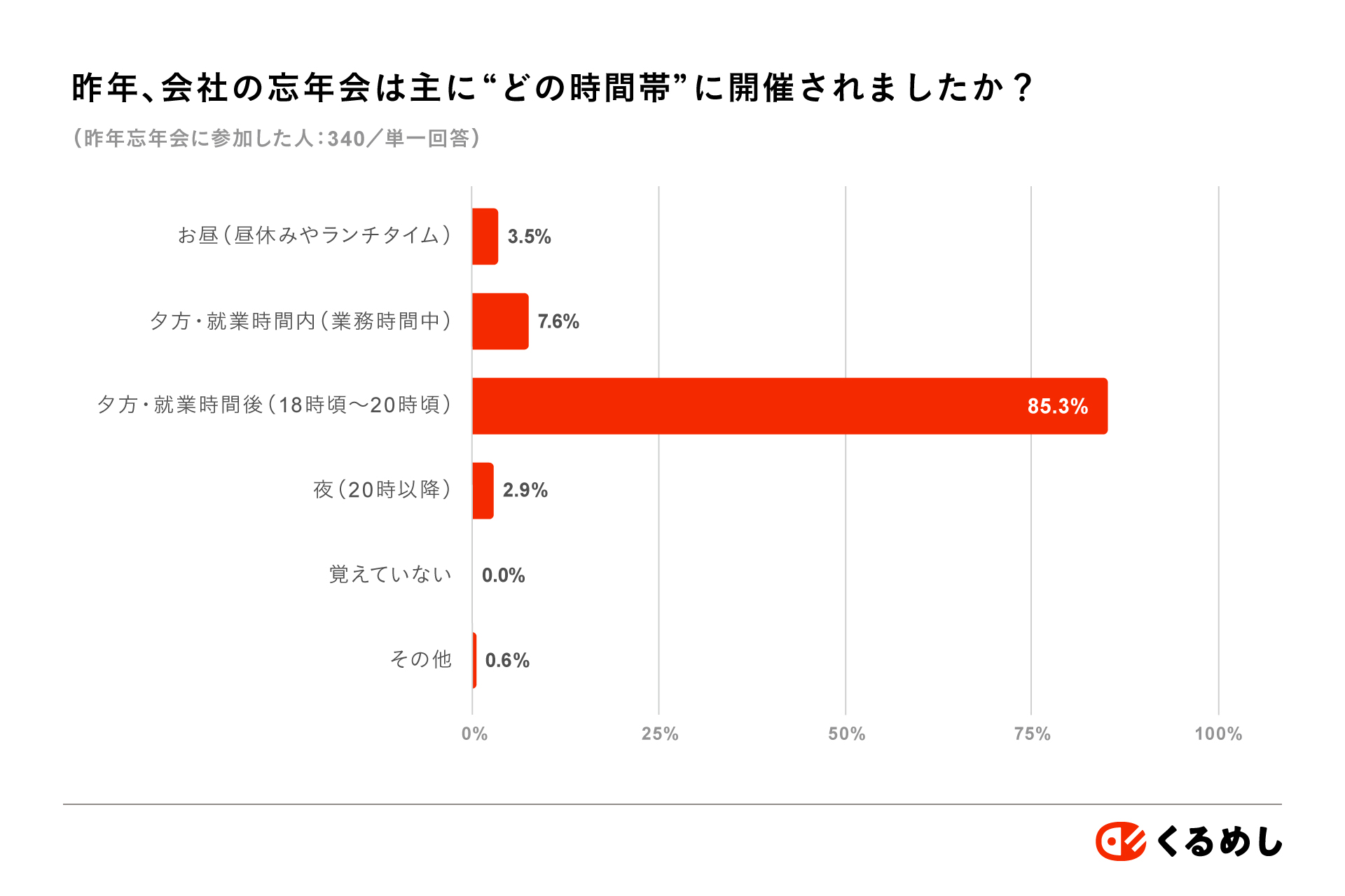 では、実際に企業ではどのような忘年会が開催されているのでしょうか。同調査で昨年の忘年会について尋ねたところ、開催場所は「飲食店(居酒屋・レストランなど)」が69.4%と最多。開催時間は“就業後の夜”が85.3%を占め、依然として“従来型の夜開催”が主流となっています。