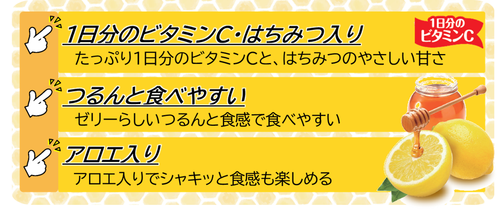「季節のビタミン習慣 はちみつレモン」は、季節によって不足しがちなビタミンを簡単手軽に取り入れる習慣を後押しする、ビタミン入りの期間限定ゼリーです。ビタミンCを、たっぷり1日分配合。レモンのすっきりした香りとはちみつのまろやかな甘さをプラスして、寒い季節にぴったりのはちみつレモンの味わいに仕上げました。つるんと食べやすいゼリーに、みずみずしいシャキッと食感のアロエ入り。
