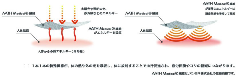 ・特殊繊維1本1本が、体の熱や外の光を吸収し、体に放射することで血行促進され、疲労回復やコリの軽減につながります。